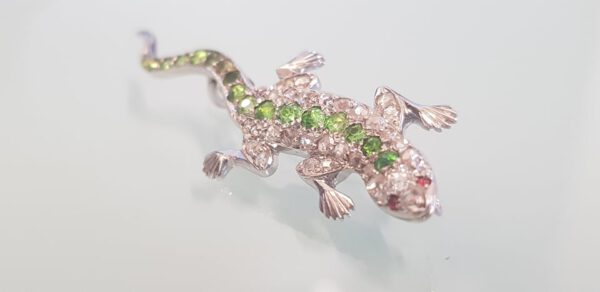 This LizardBrooch is hand assembled in 18ct white gold, it features 17 round cut green demantoid garnets, 31 old rose cut diamonds and 1 old European cut diamond.